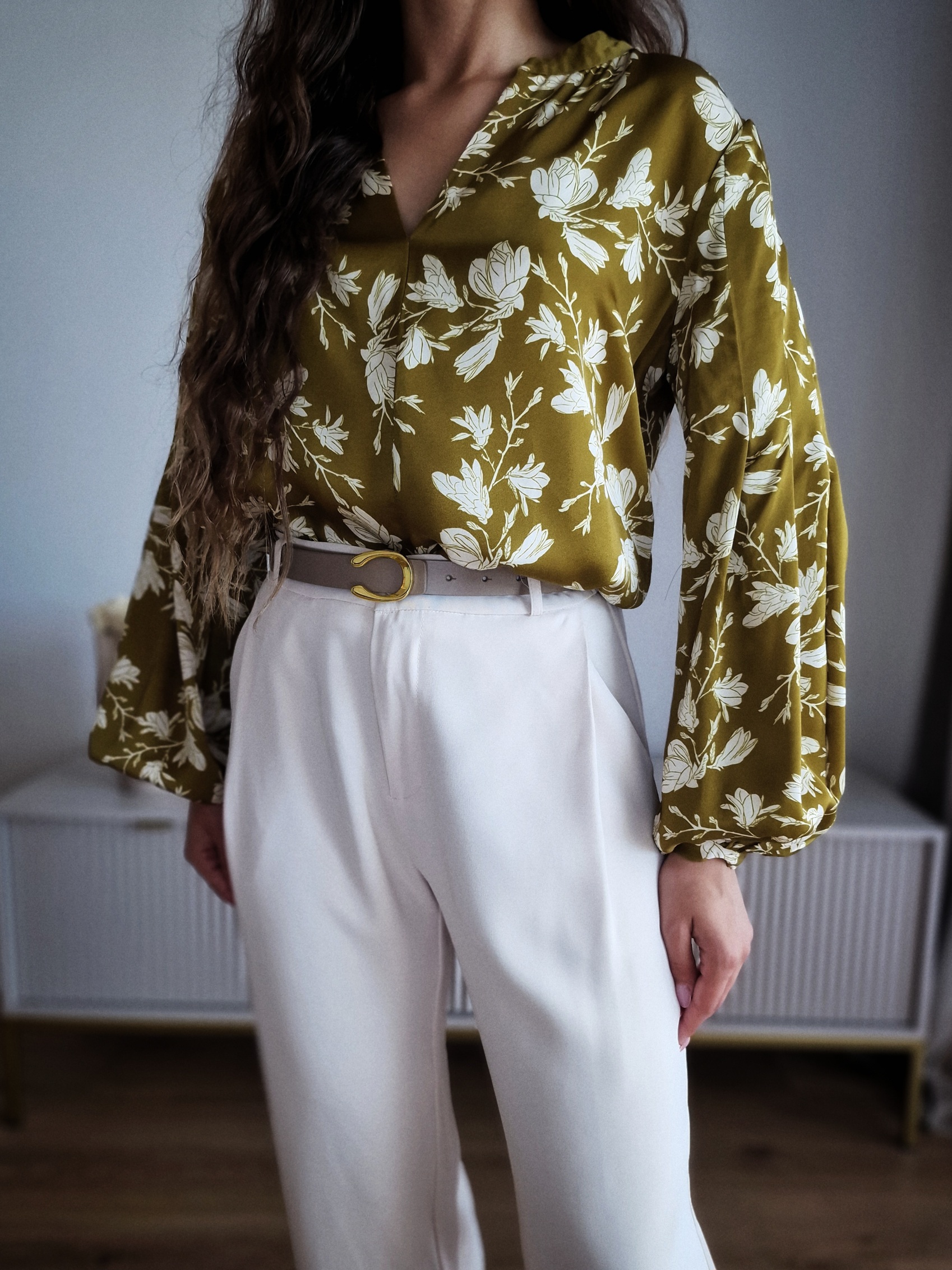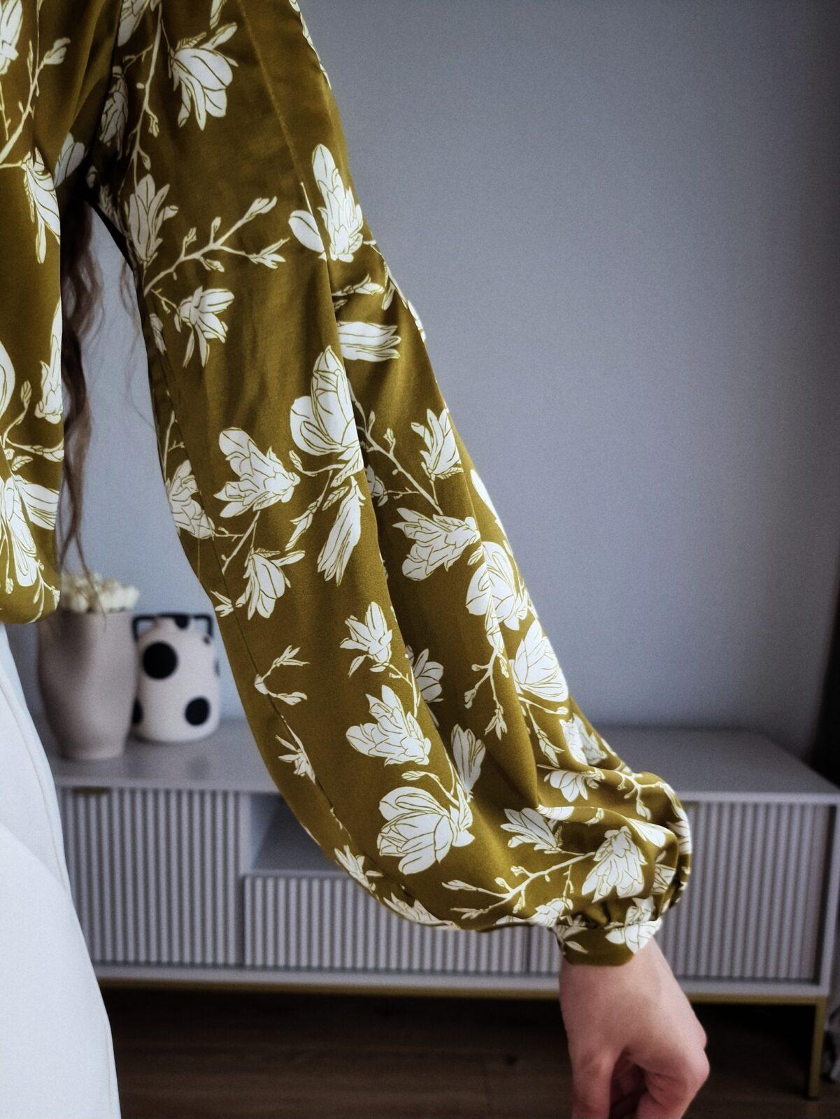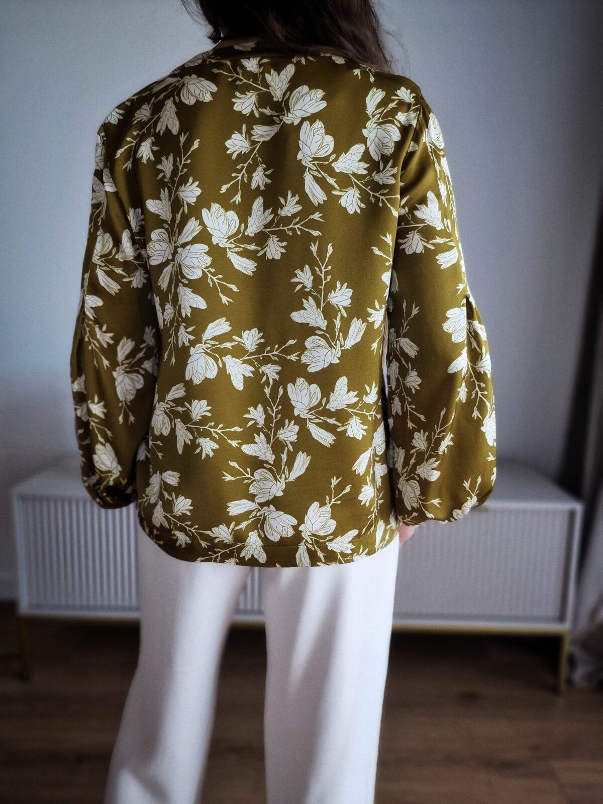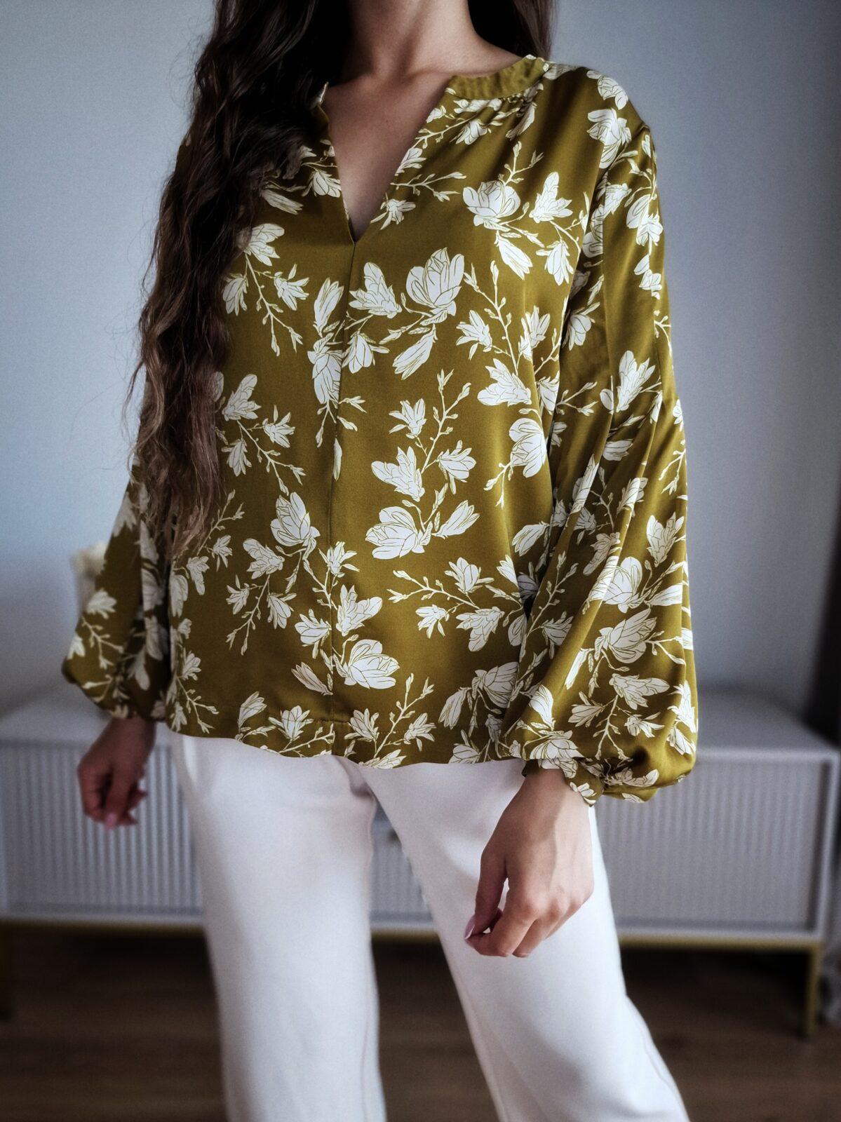 Oliwkowa bluzka w kwiaty, wiskoza satynowa, M, PREMIUM